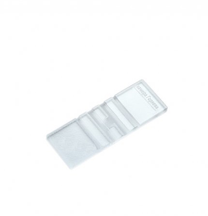 Площадка камеры, расположенная посередине, разделяется на две, каждая имеет сетку Горяева, нанесенную гравировкой. С обеих сторон находятся две другие - они предназначены для притирания покровного стекла. После притирания такого стекла создается камера типа Горяева. С двух сторон она закрыта, а с пары других - оставлены щели для заполнения.